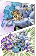 He then wounded Polnareff in a quick succession of attacks, breaking his right arm and absorbing part of his leg and cheek. He then began moving in a spiral motility around the room with Polnareff and Iggy at the center; by doing so, Vanilla Ice would kill them without leaving himself vulnerable. Unable to escape, Polnareff told Iggy to use his powers to escape and warn the others - but the dog's pride caused him to save Polnareff instead. This caused Iggy to die from over-exertion, prompting an enraged Polnareff to skewer Vanilla Ice through the head and snap his neck.